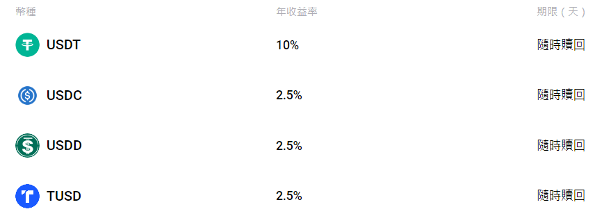 火幣交易所的「活期理財」產品目前針對穩定幣收息提供以下利率: