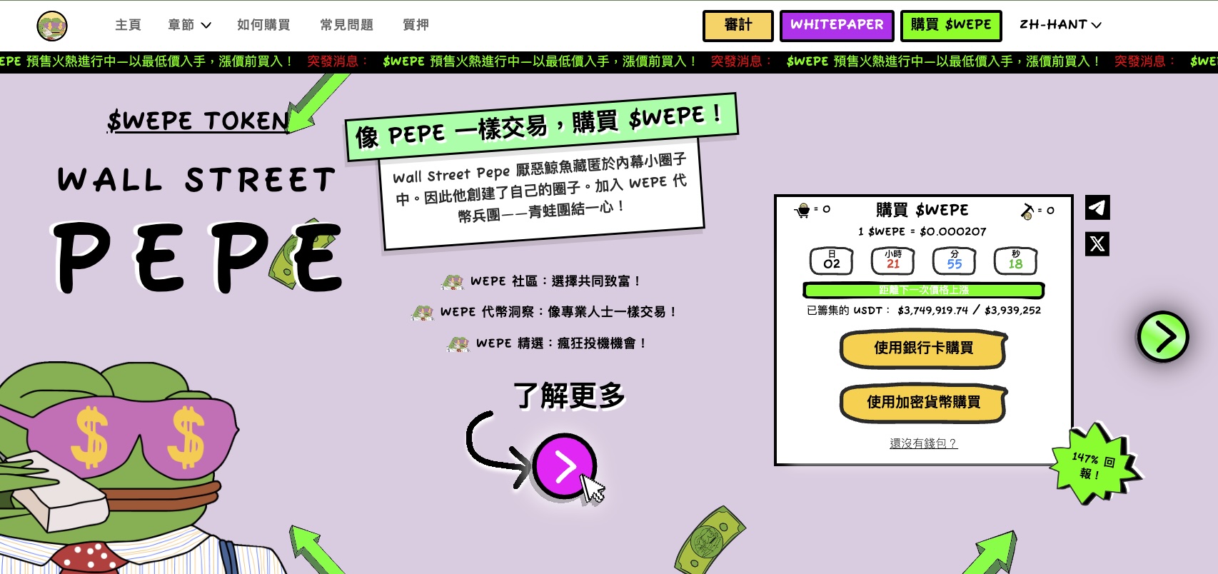 而作為 Pepe 概念迷因幣的 Wall Street Pepe ($WEPE) ,官方宣稱該代幣在短短 5日內於預售階段籌集超過 300 萬美元,也成為了新一代 meme 中被關注的項目。