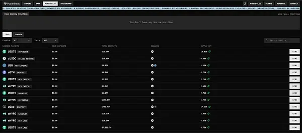 交互方式:用戶通過 hyperlend.finance 連接錢包,支援存款賺取利息、借款和 HyperLoop 一鍵槓桿功能。界面設計簡潔直觀,提供即時的利率資訊和風險指標,幫助用戶做出明智的借貸決策。