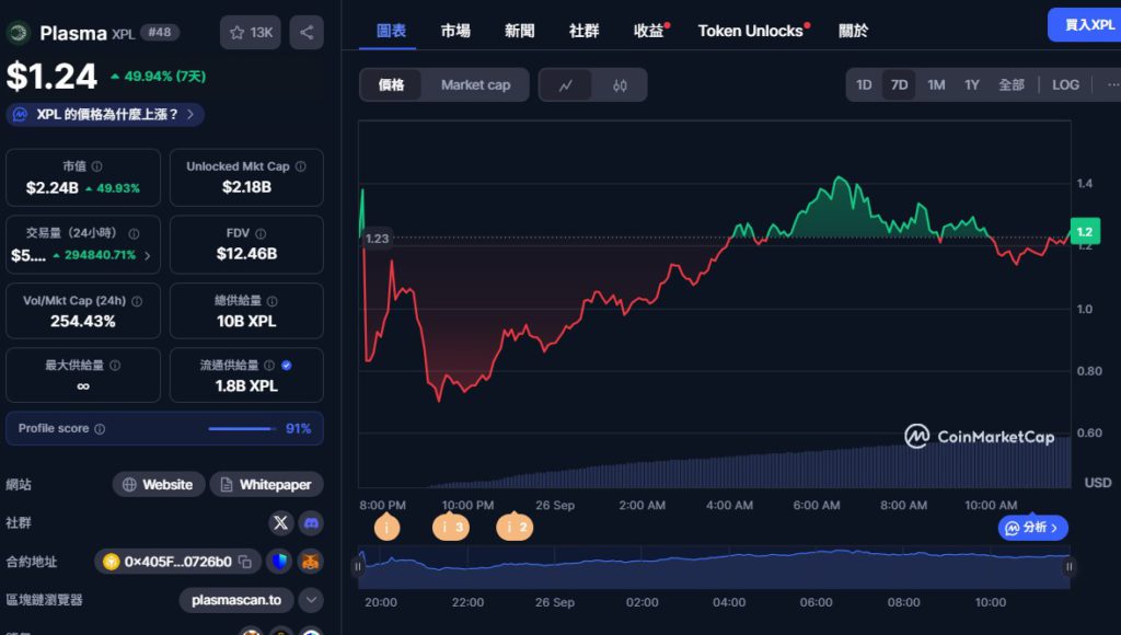 Plasma 在 ICO 階段標出 0.05 美元代價,對比 XPL 今晨衝到 1.54 美元,高出 30 倍。5 億美元完全稀釋估值在上市日膨脹到 80 億美元,流通市值 15.9 億美元,排名直接站上第 89 位。