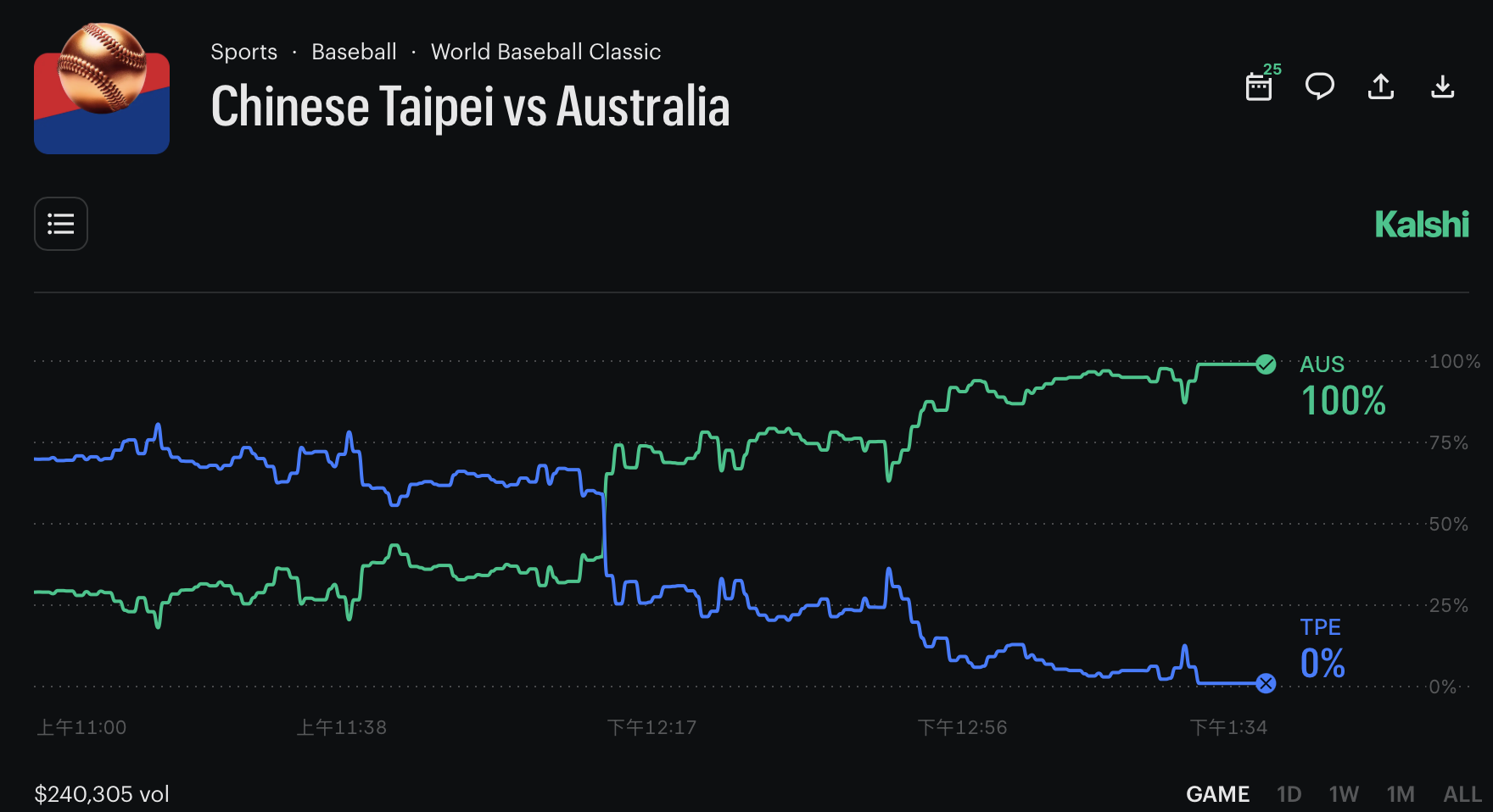 美國傳統運動賭盤給了中華隊 -240 的賠率,換算成勝率約 70%,認定台灣是明確的熱門。另一個預測市場 Kalshi 的數據也接近,澳洲的合約只交易在 32 美分,意即市場認為澳洲只有 32% 的勝率。
