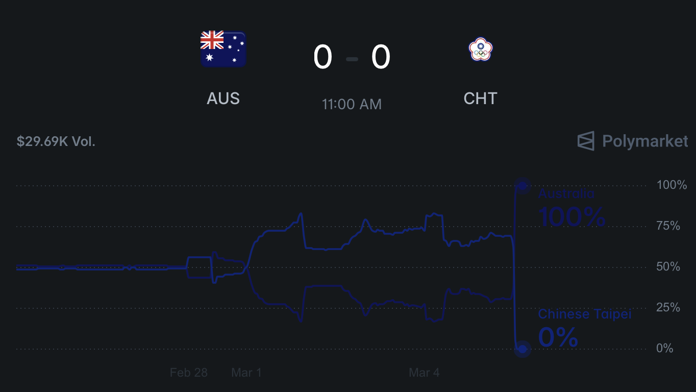 比賽結束在東京時間下午三點,Polymarket 上的 Australian 股份從 64% 直接跳到 100%。