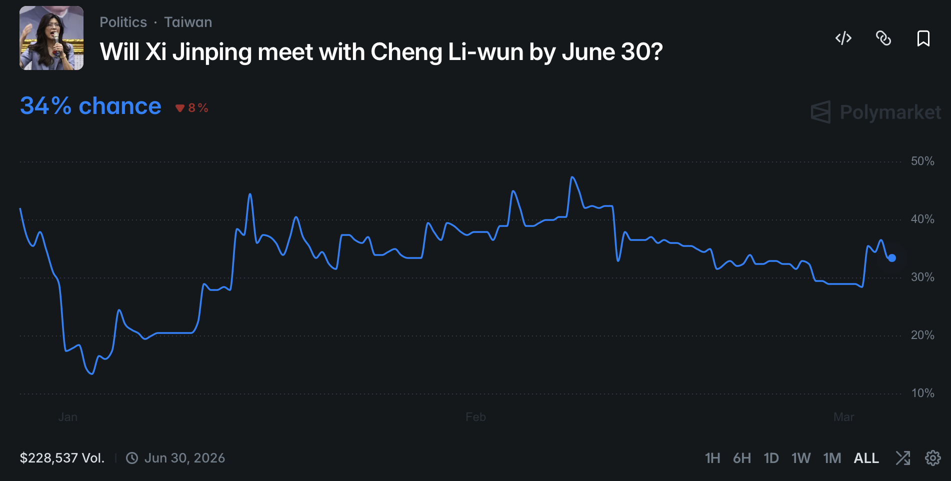 境外資金是如何看待台灣政局?去中心化預測平台 Polymarket 同時為台灣政壇兩大議題開設市場,一是「鄭麗文能否在 2026 年 6 月底前與習近平會面」,目前 Yes 僅 34%。二是「賴清德能否在 2026 年底前下台」。