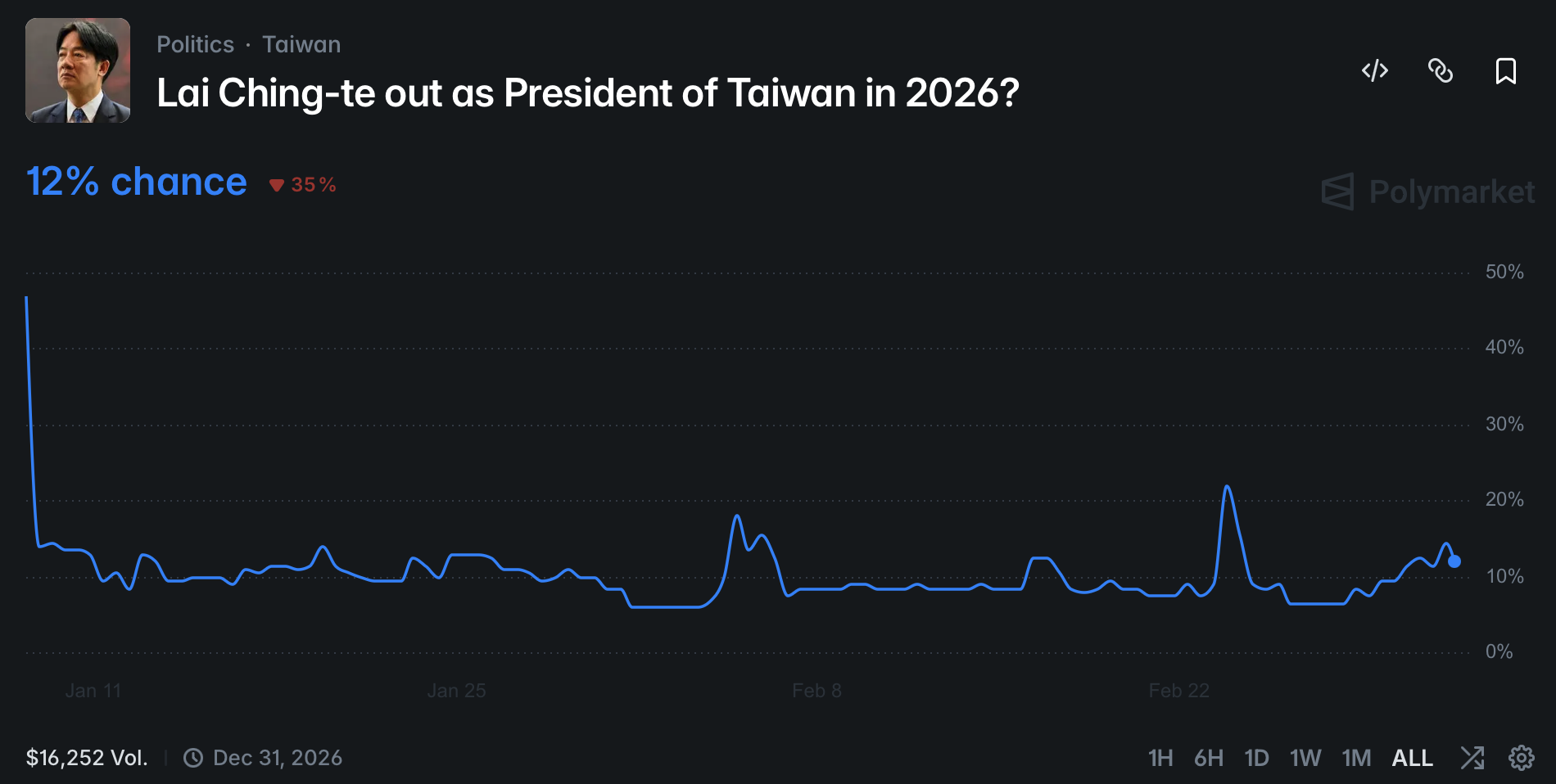其外市場同樣直白「賴清德是否在 2026 年內失去總統職位」開盤至今僅 1.6 萬美元交易量,但方向非常清楚:88% 押「不會」,12% 押「會」。結算條件涵蓋辭職、被拘押、或因故無法執行職務,截止日為 2026 年 12 月 31 日。