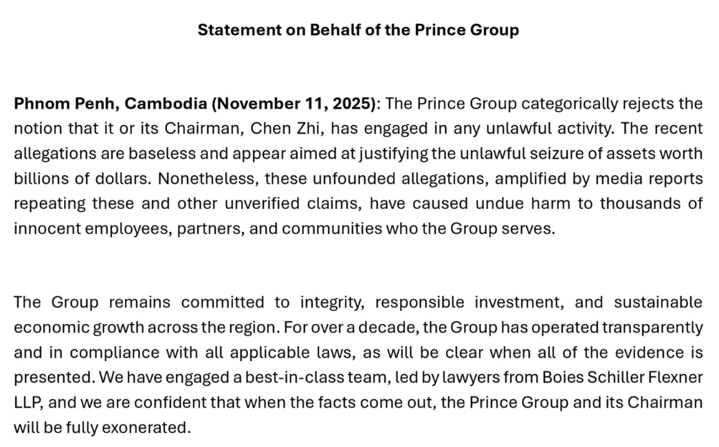 面對資產被全球多國凍結,太子集團在 11 月 11 日於官網發布由美國頂尖律師事務所 Boies Schiller Flexner LLP 代發的雙語正式聲明,火力全開,直言太子集團及其董事長陳志從未參與非法活動,誓要為太子集團及其董事長陳志徹底平反,以下是太子集團正式聲明的原文:
