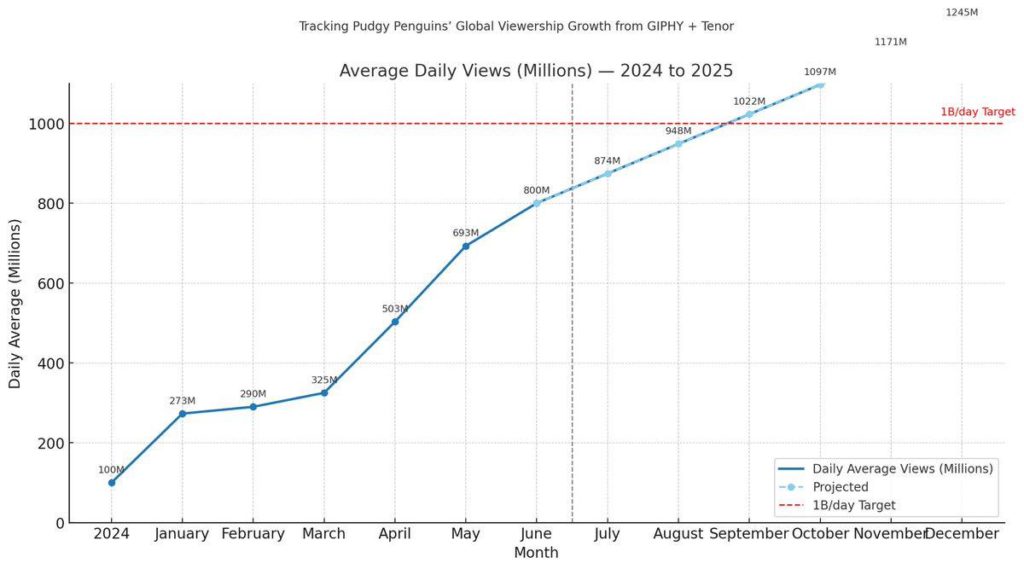 不僅如此,他們甚至通過 TikTok 和 Instagram 等主流平臺製造病毒式傳播,以及登陸蘇富比拍賣、在紐約時代廣場展出以及現實活動等方式,大幅提升品牌曝光度和公眾認知度。這樣的多維度行銷和傳播策略,幫助 Pudgy Penguins 不斷擴大全球影響力,活躍受眾規模也快速增長至數百萬級別。根據 Pudgy Penguins CEO Luca Netz 披露,截至 2025 年 7 月,胖企鵝的全球觀眾數量已達 8740 萬,預計年底將接近或超過 1 億日的目標,顯示出顯著的增長潛力。