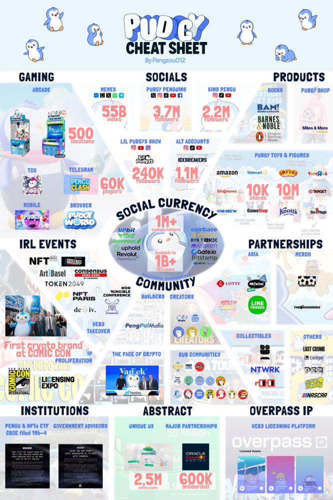 從 Pudgy Penguins 與沃爾瑪、亞馬遜、Target 和 Walgreens 等合作推出或出售實體玩具系列,並在銷量擊敗迪士尼、變形金剛等傳統強 IP,到聯手好萊塢頂級經紀公司 WME 和兒童圖書出版商 Random House Kids 等合作,持續拓展衍生內容,再到開發 Pudgy Party 和 Pengu Clash 等產品,Pudgy Penguins 通過高辨識度的審美語言,結合線下玩具、電商、社交內容、IP 授權等方式,打造品牌構建的長線週期,並積極向主流文化滲透。
