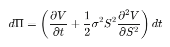 Step 2:建立 Delta 避險投資組合 Π = V − (∂V/∂S)·S,計算 dΠ——dW_t 項完美消掉,這個組合在局部是無風險的。