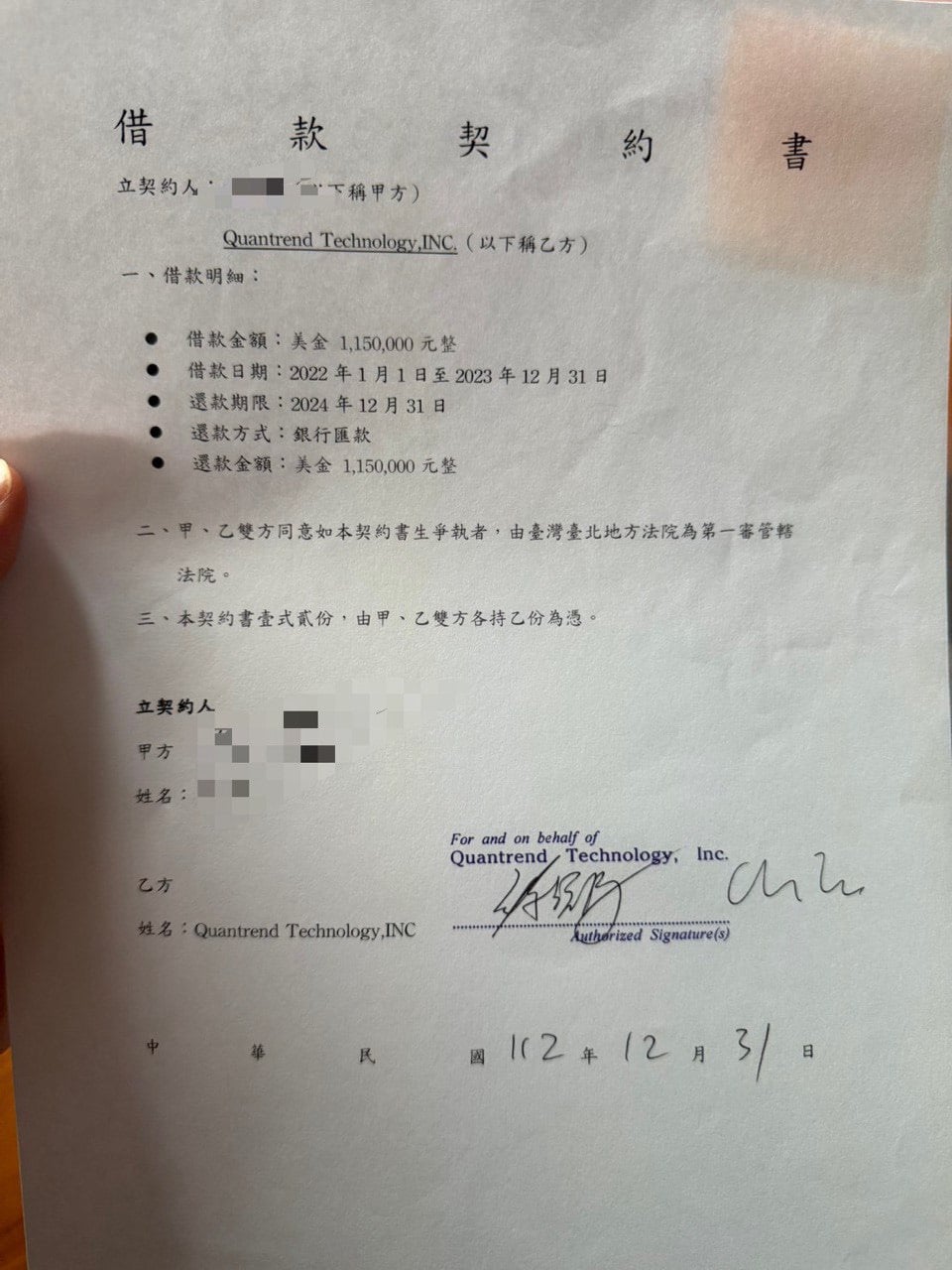 徐靖騰並提出先前借款給公司的借款契約書數份,稱這些借款事實存在,自己是量趨科技最大的債權人。
