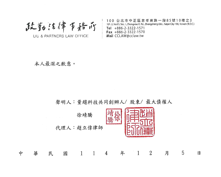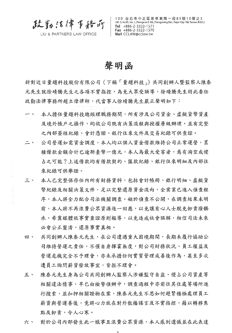 (前情提要:獨家》量趨科技陳泰元聲明回擊:前總經理徐靖騰涉掏空超過1億元!我被無證據負面攻擊 )