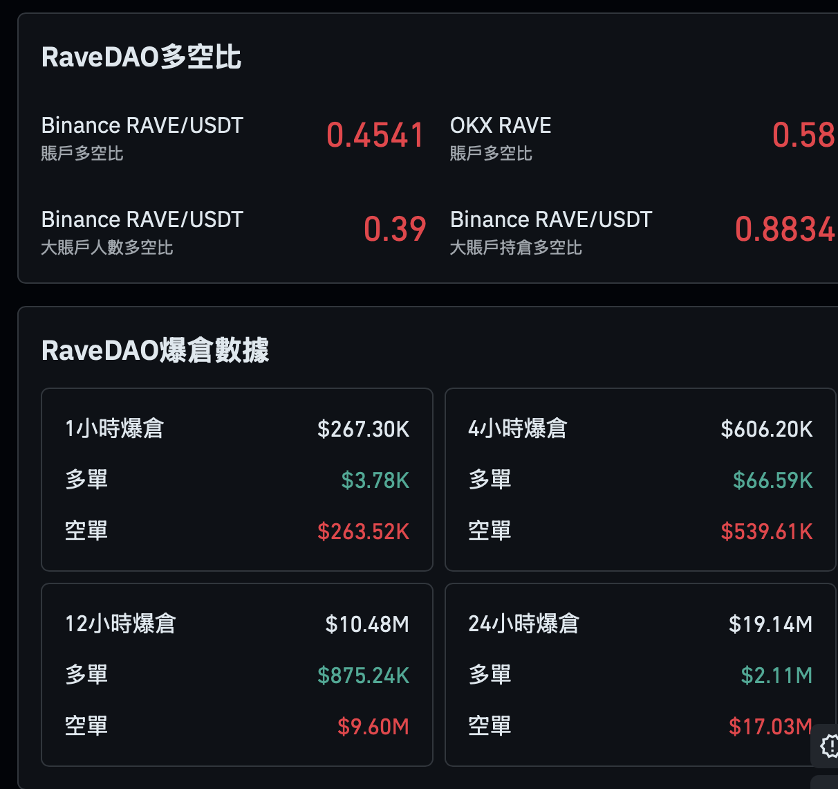 近 24 小時爆倉 2,064 萬美元中,空單佔 1,834 萬美元,多空比呈現空方主導,Binance RAVE/USDT 帳號多空比 0.4541,OKX 同一指標 0.58,Binance 大帳號人數多空比更低至 0.39。說明在價格突破 $27 的過程中,做空資金持續被清算出場。