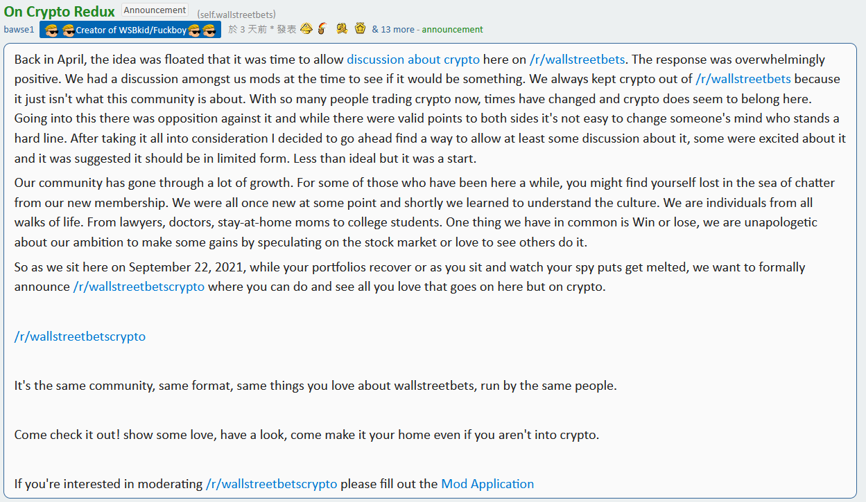 WSB 版主 bawse1 表示,早在 4 月份就有人希望可以在 /r/wallstreetbets 母版上討論加密貨幣,管理團隊當時討論後否決,理由是該版的初衷是討論股票和期權交易,在當時的加密狂潮下,一旦開放則可能造成加密話題完全佔據該版。