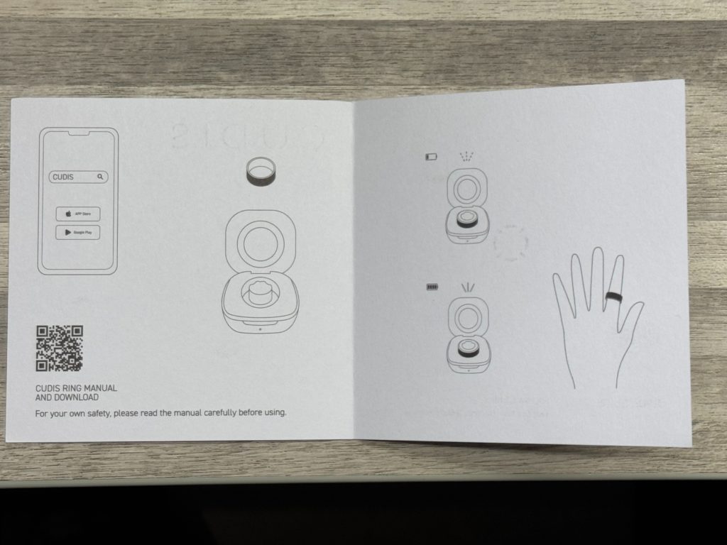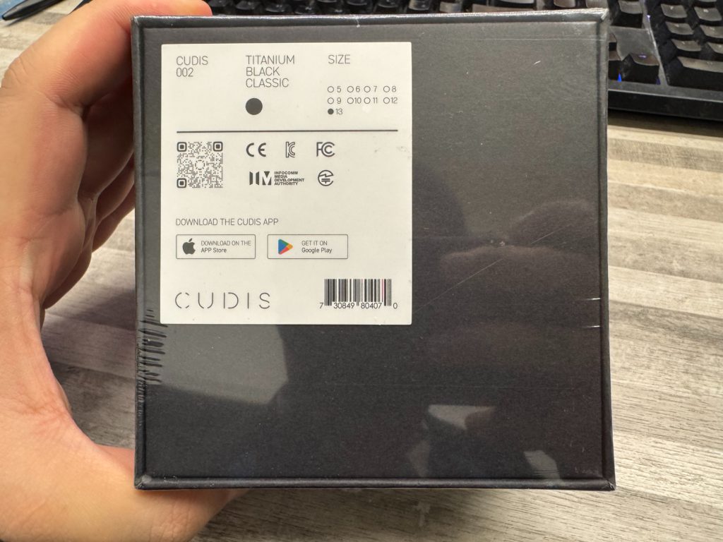 本體包裝正面印有「CUDIS」樣式紙雕,背後紀錄了訂購的戒指樣式,包含顏色(金、玫瑰紅、銀、黑),與不同戒圍(尺寸8~13),有印表機的讀者可以使用官方提供的列印文件以A4尺寸列印,並剪下尺標來測量戒圍。