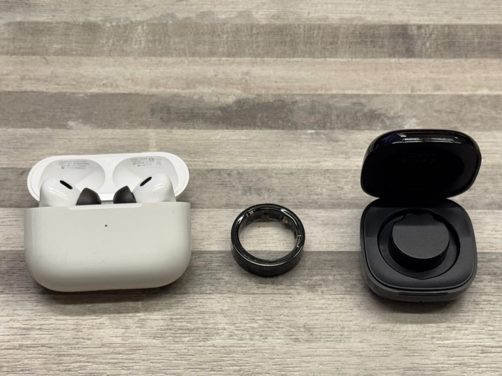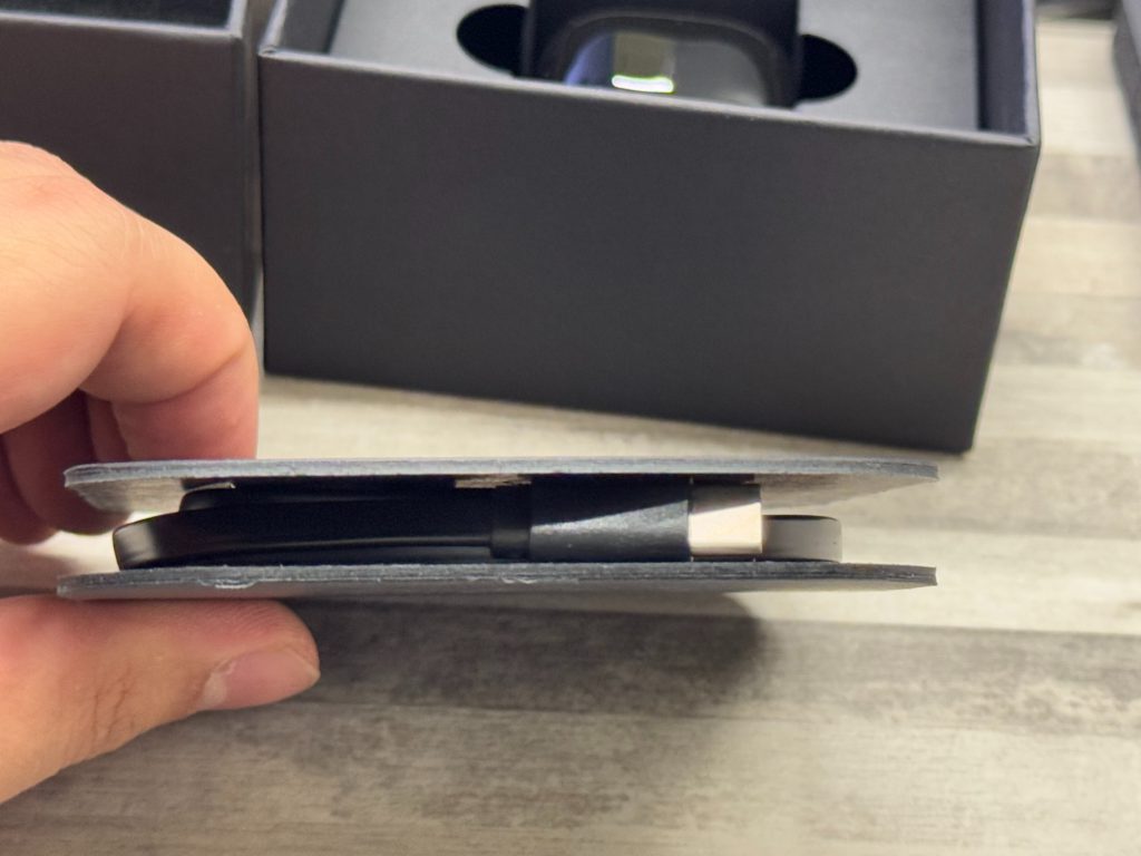 盒裝內含戒指本體、說明書、雙 type-C 充電線隔板與充電盒。其中充電線實測無數據傳輸功能、僅支援充電,充電盒採亮面設計,比起AirPod Pro 2 充電盒小上不少。
