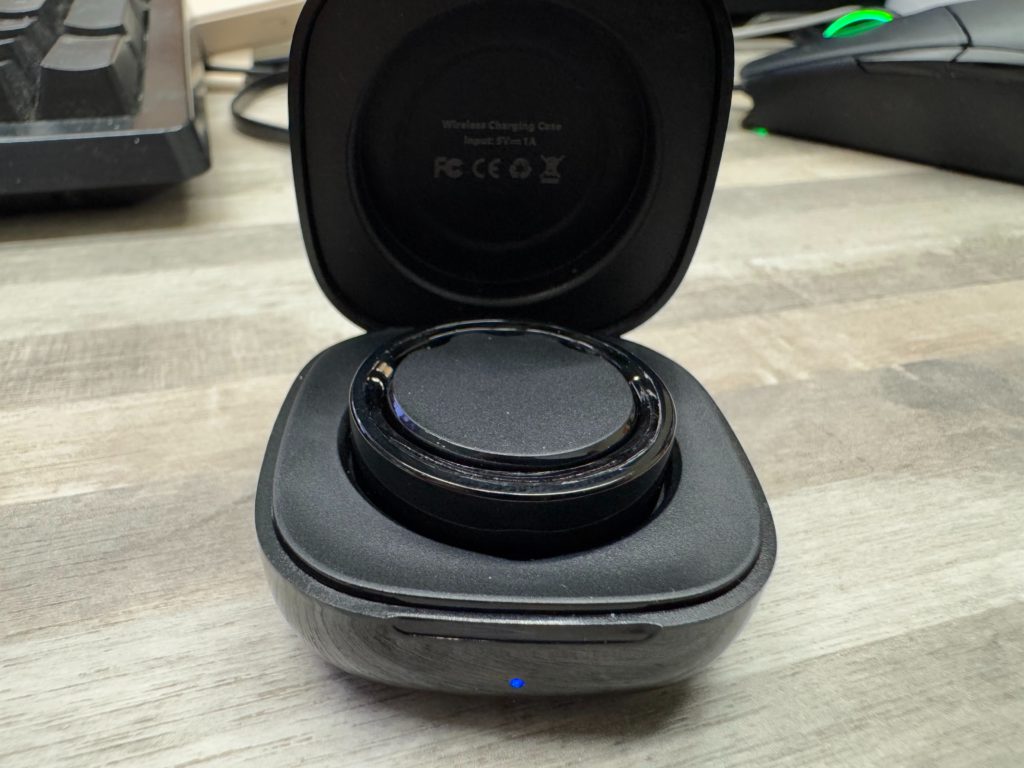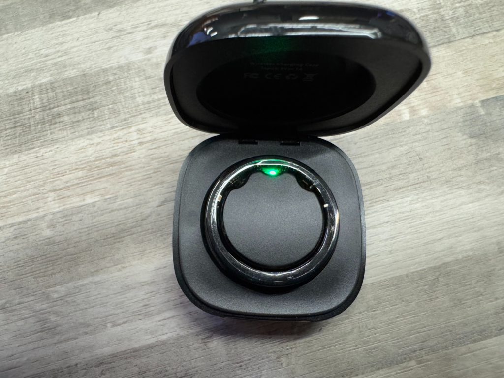 當充電盒中,插上Type-C與電源後,充電盒本體前端會顯示藍燈表示進入可充電的狀態,而戒指本體在放入亮藍燈的充電盒中時,就會使用綠色的心率探測器閃亮綠燈作為充電中的顯示,可說是非常聰明的設計。