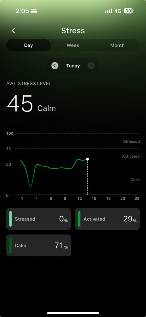 相比蘋果Apple Watch 原廠未提供壓力相關偵測的功能,需要額外再購買「Stress Watch」等付費 APP,CUDIS 002 原廠就內建壓力偵測,實測在假日與睡覺時間時,會出現壓力較低的指數,工作開會時的確會出現標高的情況,而壓力過高時就會出現紅色警告,提醒用戶注意身心協調的重要。