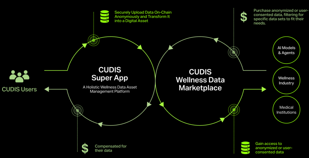 而 CUDIS 預計在未來會開放將其健康數據,給經過 KYC 認證的外部數據使用者(AI與AI代理、健康產業、DeSci、醫療機構、保險業者)提供一個資料市場,讓他們可以進行資料篩選與採購,來獲取他們需要的去辨識化的匿名數據,而該資料的利潤將會分給資料的使用者與持有生態代幣的用戶。