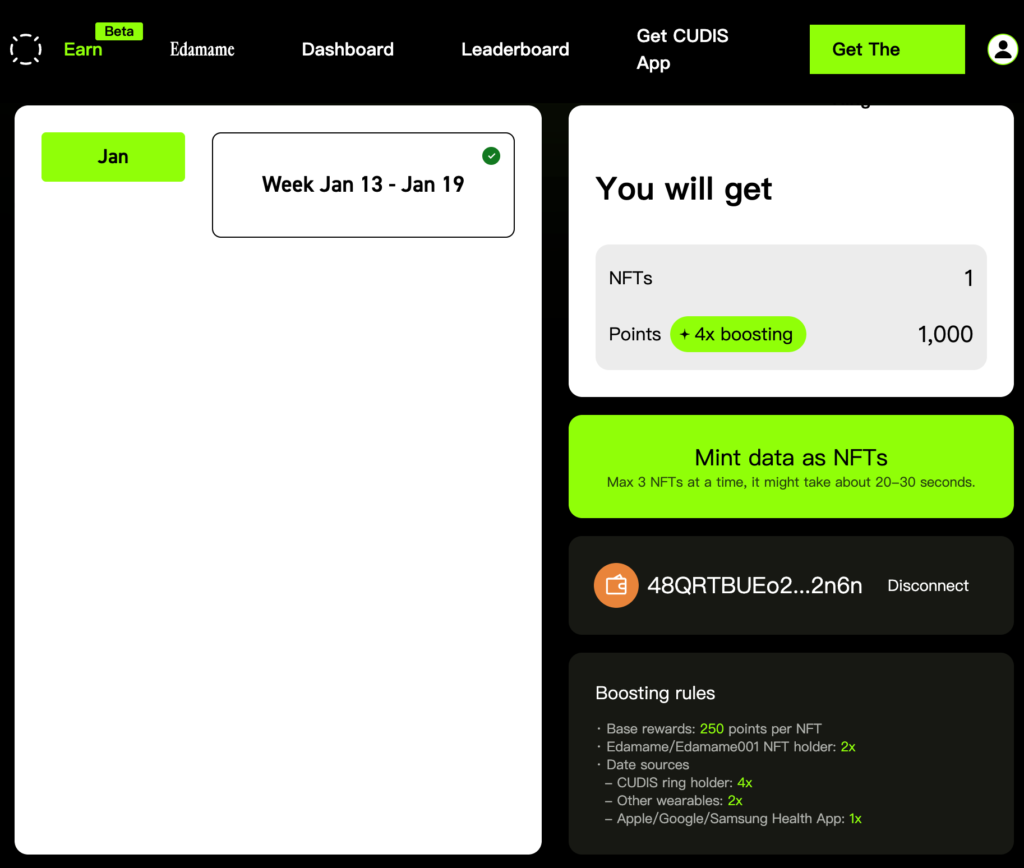 在NFT鑄造的過程中,將把你的帳戶的每周積分作為可選取項目,來做為製造NFT的基底,而還會根據你的積分來源(戒指、其他穿戴裝置、健康程式)來給予不同的權重,目前戒指是綁定最高的4倍積分。