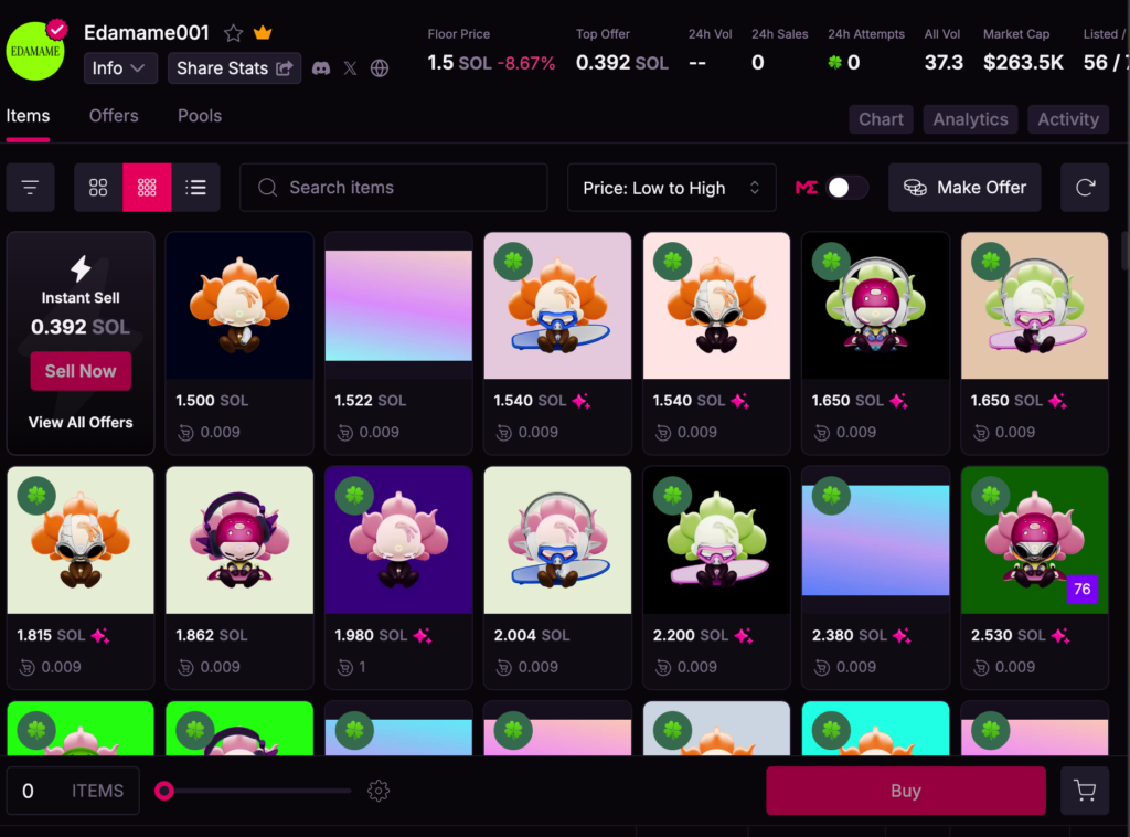 值得一提的是,在 2024 購入 CUDIS 001 的用戶,大多已經被空投 Solana NFT「Edamame」、「Edamame001」,依當前 MagicEden 報價顯示,地板價分別為 1.33 SOL、1.1 SOL,根據當前 SOL 價格為 273 美元來計算,可說是第一期的 CUDIS 001 的用戶已近數回本