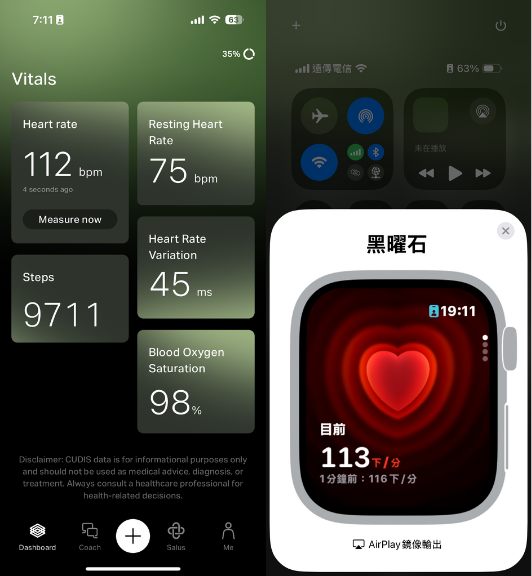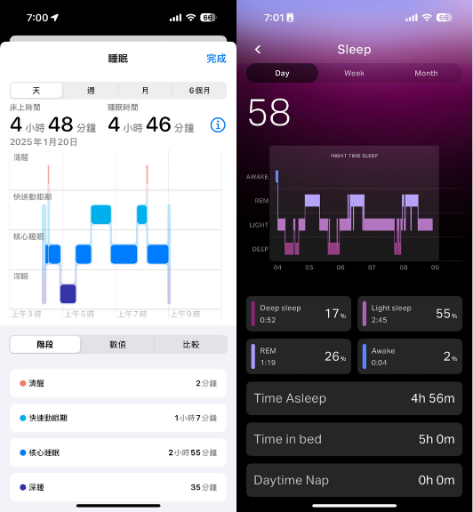 在睡眠數據上,CUDIS 002(下右)所記錄的數據可說與 Apple Watch 10 (下左)非常接近,只有十分鐘左右的誤差,其中核心睡眠與深睡的定義可能較為不同,但時段都完全對的上,顯示 CUDIS 002 在睡眠監測功能上有基本可用性、且可以判斷不同時段的睡眠狀態。