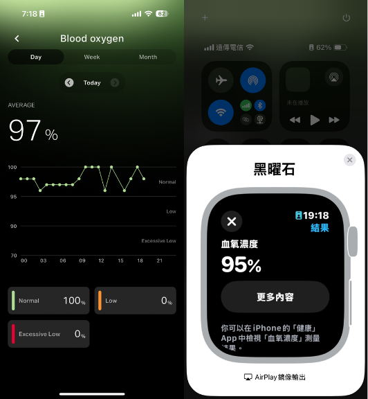 至於即時血氧濃度上則分別測得 97%、95%,CUDIS 002 與 apple watch 出現2%誤差。