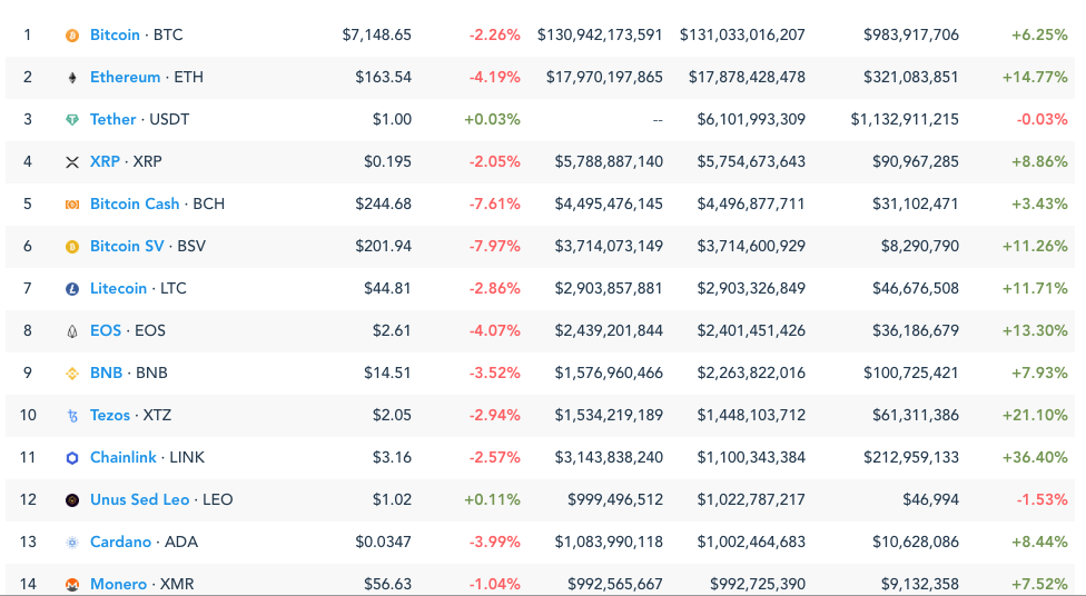 市值最大的比特幣(BTC)在過去 24 小時內下跌了 2.27%,現報 7,150 美元。總市值已經下降到 1,309 億美元,佔比來到了 65%。而加密貨幣的總市值更是跌破了 2,000 億美元。市值前十名跌幅最大的就是即將要減產的 BSV,以及剛減產的 BCH,分跌下跌 7.97%、7.61%。