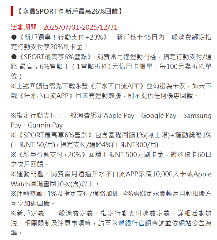 永豐 SPORT 卡的核心機制是「消耗熱量換回饋」。用戶只要透過專屬 App「汗水不白流」連結 Apple Watch、Google Fit 或手機,每月消耗 1 萬大卡(約跑步 20-30 公里)或完成 10 次 Apple Watch 圓滿畫圈,就能解鎖額外 1% 回饋。一般消費已有 1% 基本回饋,行動支付與指定通路再加 4%,合計最高 6%,新戶首刷期更可衝到 26%。
