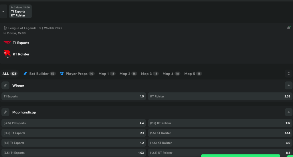 根據各大預測市場的分析,多半推測 T1 有較高機率以贏過 KT,不過在Polymarket 等平台上,僅有簡單勝率的勝負,無法看到市場對於詳細比賽的預測。
