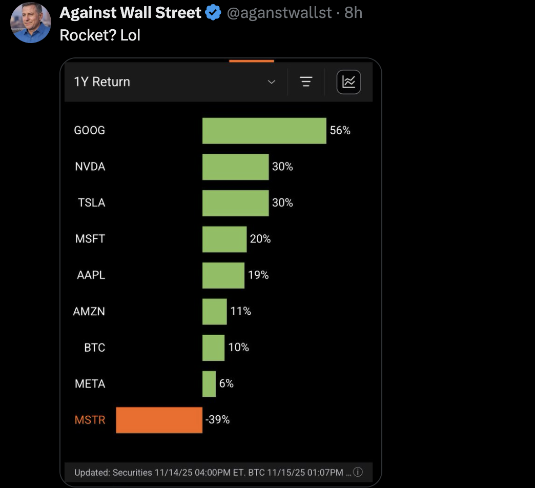 自然,散戶看著自己的 profolio 在紅棒下越扣越多,心裡像在滴血,不像 Michael Saylor 這種等級的大老闆更有賠錢的底子。社群上也湧現不少人拿出 MSTR 股票過去 12 個月的表現,已經跌逾 4 成來反酸: