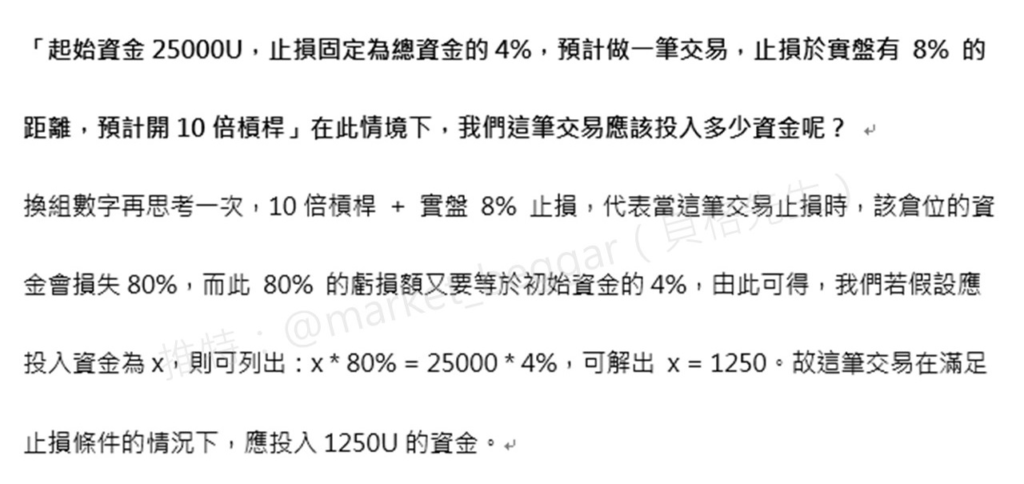 「起始資金 60000U,止損固定為總資金的 2.5%,預計做一筆交易,止損於實盤有 12% 的距離,欲投入 3125 U」