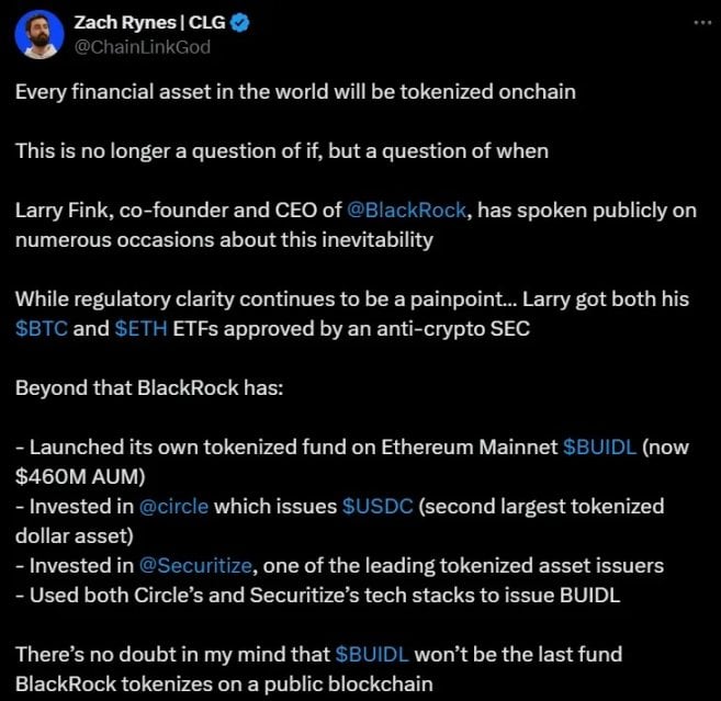 Zack Ryne(@ChainLinkGod)的觀點突顯了這一點,他指出世界上每一種金融資產最終都將在鏈上被代幣化。「代幣化世界」的口號在加密週期中一直很流行。他斷言,這不再是一個「是否」的問題,而是「何時」的問題。儘管監管透明度仍然是一個挑戰,BlackRock 的共同創辦人兼 CEO Larry Fink 公開談到了這種必然性。雖然 SEC 一向對加密貨幣持反對態度,Larry 的比特幣和以太坊 ETF 成功獲得了 SEC 批准。