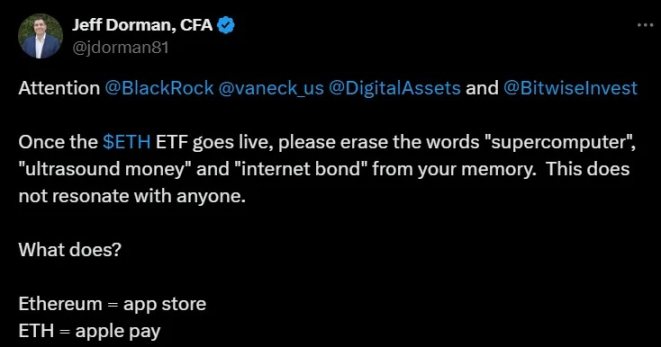 David: 好的,現在我們來談談第二個敘述:Ethereum 是一個應用商店(app store)。這個理念來自 Jeff Dorman,他在推文中寫道:「注意 BlackRock、VanEck、Digital Assets 和 Bitwise:一旦 ETH ETF 上市,請刪除 「超級電腦」、「超穩健貨幣」 和 「網際網路債券」 這些詞彙。這些詞彙對任何人都沒有共鳴。什麼敘事才有共鳴呢?那就是 Ethereum 是一個應用商店。」這種角度吸引了許多人,因為對於那些沒有加密背景、不知道 Ethereum 是什麼的人來說,也會對這個概念非常熟悉。