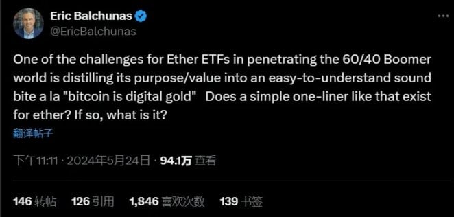 David:今天這檔節目實際上源於 Eric Balchunas 的一條推文,他指出了以太坊 ETF 面臨的一個挑戰:將以太坊的願景和價值提煉成類似於「比特幣是數位黃金」這樣易於理解的口號,來滲透 60 歲以上的前嬰兒潮一代的世界。以太坊有簡單的宣傳口號嗎?如果有,那是什麼?比特幣是數位黃金。比特幣的美在於其簡單性,一行簡潔的口號就能描述清楚,而以太坊的涉及的範圍太廣,我認為則要至少 60 秒才能說清楚。因此,我們今天在節目的最後為以太坊 ETF 的推廣話術的時間設定為 60 秒。