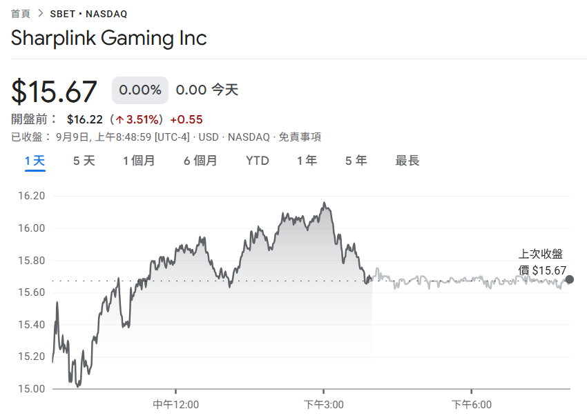撰稿當下,SharpLink 股價在美股開盤前暫報 16.24 美元,盤前略微上漲了 3.38%,市值約為 30 億美元。這一股票回購計劃能否刺激投資者信心,助推其股票回漲,讓我們繼續保持關注。