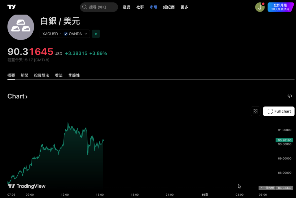 白銀價格首次突破 90 美元/盎司大關,黃金同步逼近紀錄高點,貴金屬市場在聯準會獨立性受威脅、地緣政治緊張與降息預期等多重利多推動下持續飆漲。花旗將白銀三個月目標價上調至 100 美元,Lotus Asset 更喊出年底 150 美元的激進預測。
