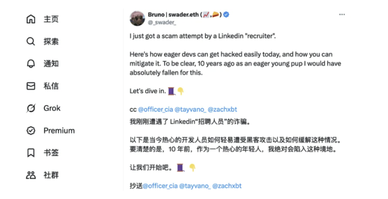 近年來,在 LinkedIn 平臺上針對區塊鏈工程師的釣魚事件時有發生,昨天,我們在 X 上注意到 @_swader_ 釋出的一個帖子。這個遭遇其實是針對區塊鏈工程師招聘釣魚的一個縮影,接下來我們分析下這個案例。