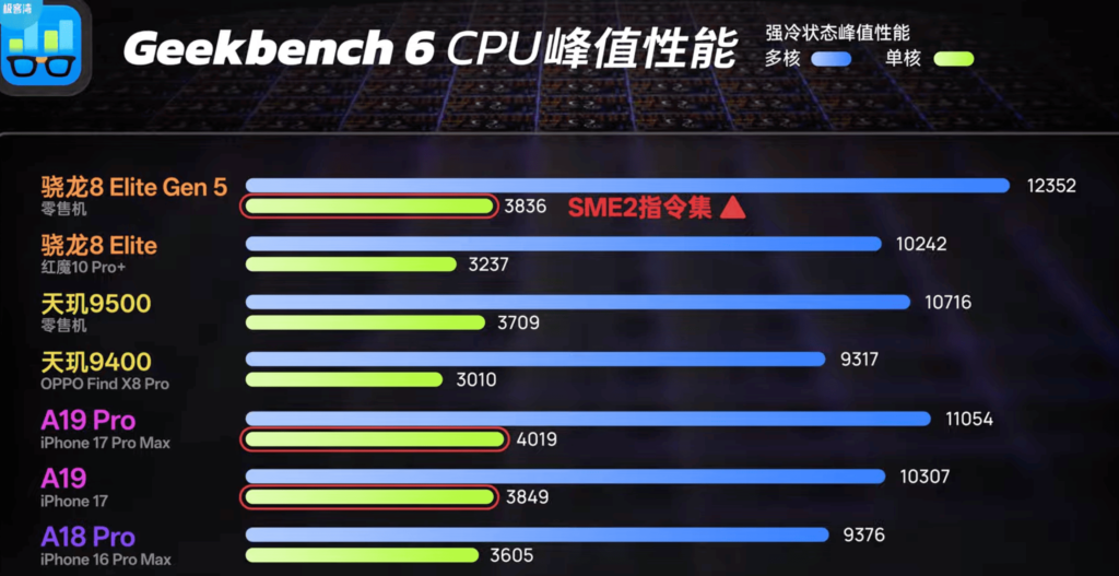 8L5 採 2 大+6 能效的八核心配置,主頻最高 4.6 GHz,再加上 SME 單元,使 AI 與向量運算吞吐更高。相對地,A19 Pro 維持 2 高性能+4 高效率架構,雖核心較少,但單核微架構深度優化。GeekBench 6 結果顯示,A19 Pro 單核 3895 至 4019 分,仍領先 8L5 的 3846 分;然而 8L5 多核 12546 分,反超 A19 Pro 的 9746 至 11054 分,說明核心數與時脈堆疊對多執行緒負載依舊有效,蘋果陣營僅維持約2%的單核優勢。