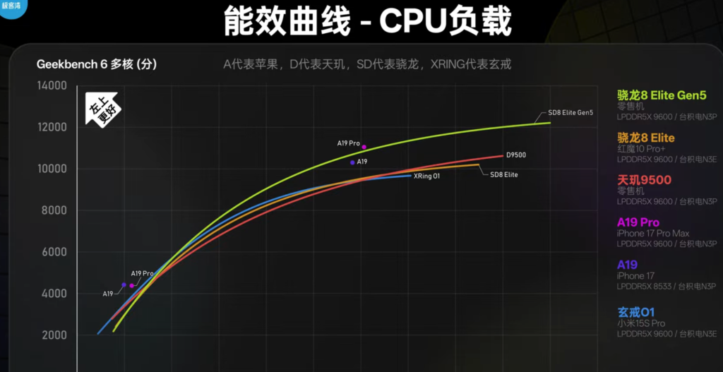 而在能效上,8L5直接落在 A19 Pro 與 A19 之間,更是遙遙領先天璣9500,可說蘋果A19 Pro幾乎所差無幾。
