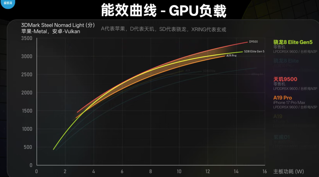 在跑分上,8L5 以3100分的成績領先不到 3000分的 A19 Pro ,並實現全段落的全面超越,儘管看起來遜於天璣9500,但實際在手機上最常跑的6~8W區間,與天璣9500 幾乎一致,而該區間也超過 A19 Pro的成績。