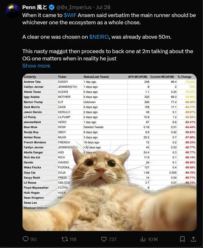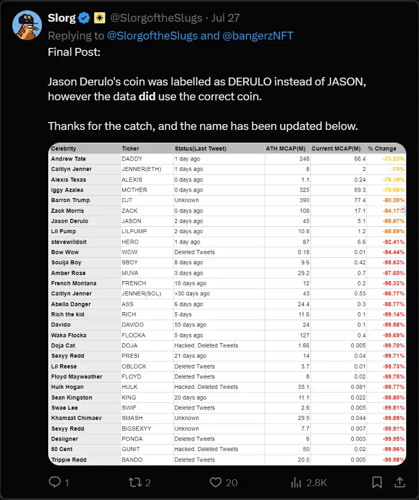 除了跑路和 MEV,零售市場的前景仍然黯淡。名人們選擇了 Solana 作為他們的首選鏈,但結果並不理想: