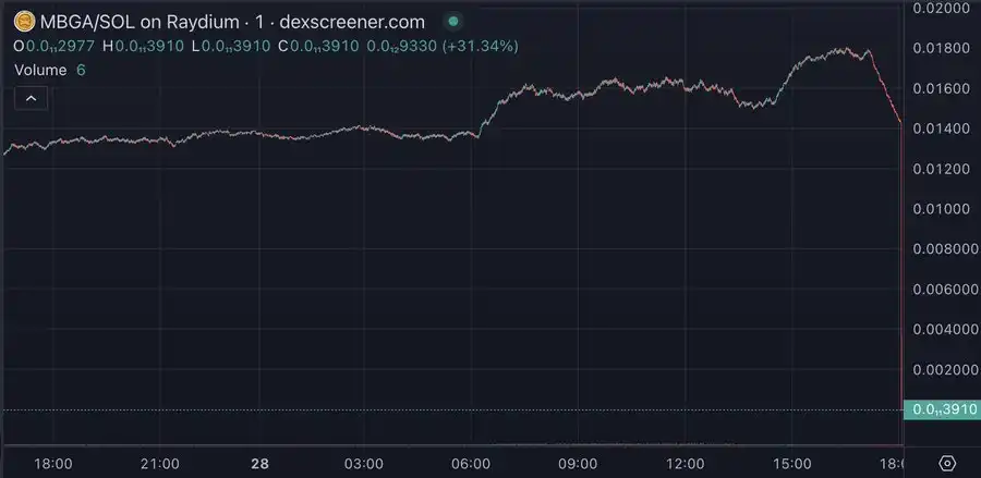 每一個低流動性的資金池專案,都在過去 24 小時內出現了跑路現象。以 MBGA 為例,在過去的 24 小時裡,共有 46,000 筆交易,交易量達到 1,080 萬美元,2,845 個獨立錢包參與買賣,並在 Raydium 上生成了超過 28,000 美元的手續費。 (作為對比,一個類似規模的合法流動性池 $MEW,只產生了 11,200 筆交易)