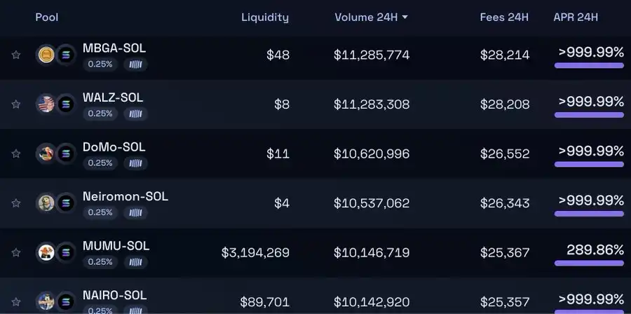 為了理解交易數量的差異,分析 Raydium 的流動性池(LPs)是很有啟發性的。即便是初步觀察,也能明顯看出有些不對勁: