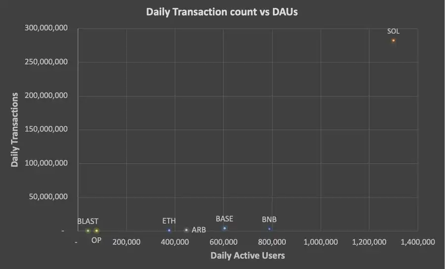 從表面上看,SOL 的數據非常亮眼,每日活躍使用者(DAUs)超過 130 萬,而 ETH 僅為 376,300。然而,當我將交易數量納入考量時,發現了一些奇怪的現象。