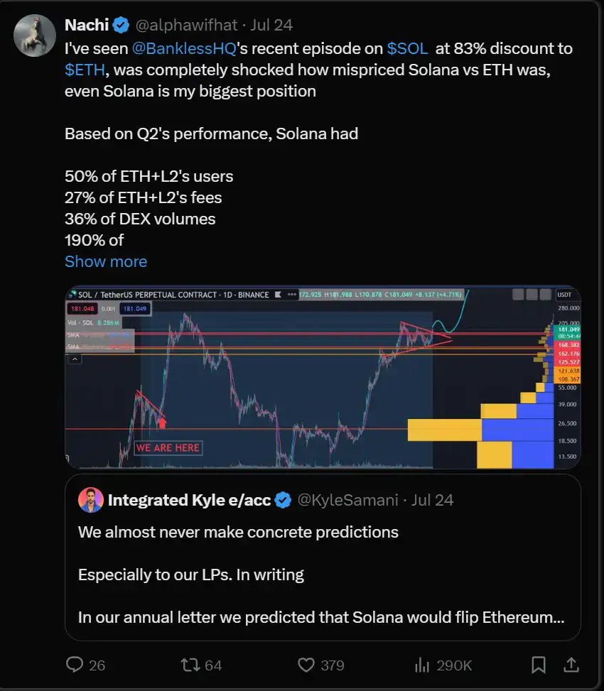 然而,當我深入研究資料時,結果令人不安…… 在這篇文章中,我將分享我的發現,以及為什麼 Solana 可能是一座紙牌屋。首先,讓我們來看看由 @alphawifhat 清晰闡述的牛市論點: