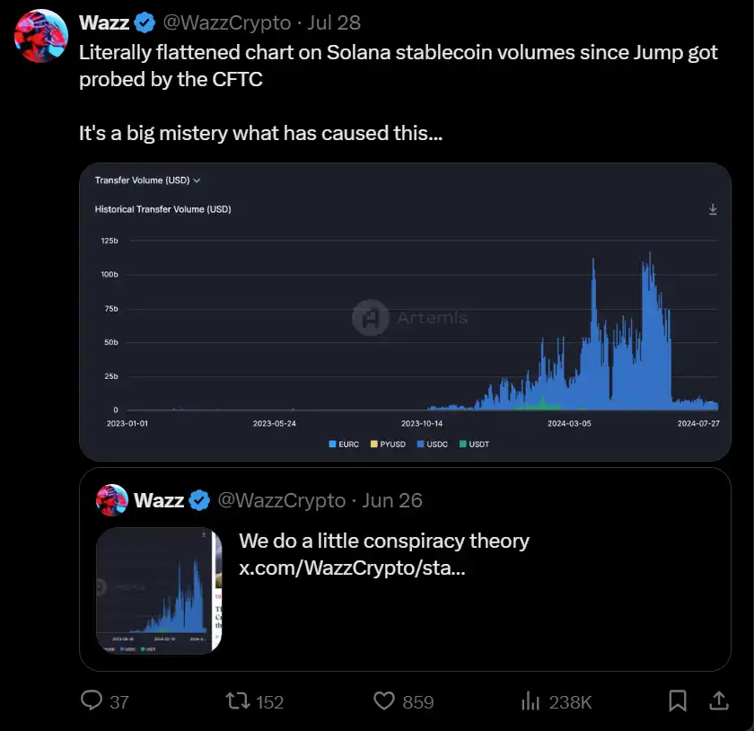 穩定幣交易量的動態進一步強調了這一點 ——@WazzCrypto 指出,當 CFTC 宣佈正在調查 Jump 時,交易量突然下降。