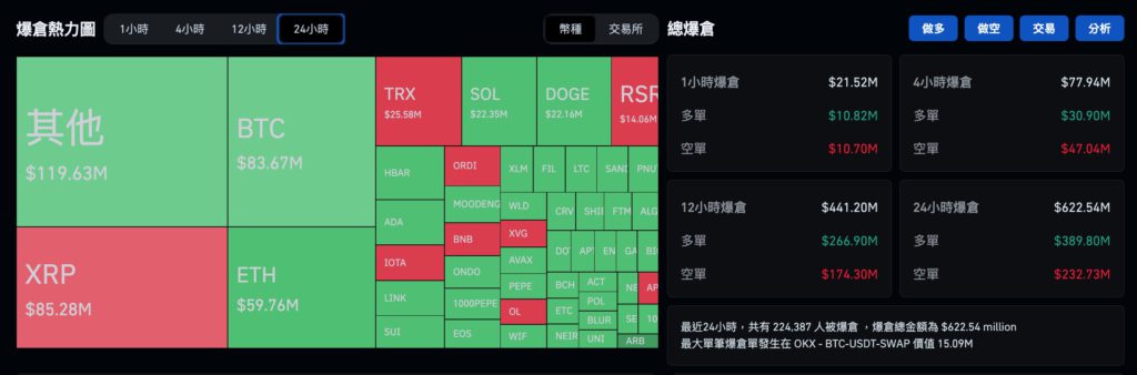 據 Coinglass 數據顯示,韓國緊急戒嚴令發佈後造成的震盪,導致整體加密貨幣市場全網在近 24 小時內爆倉超過 6.2 億美元,超過 22 萬人爆倉。