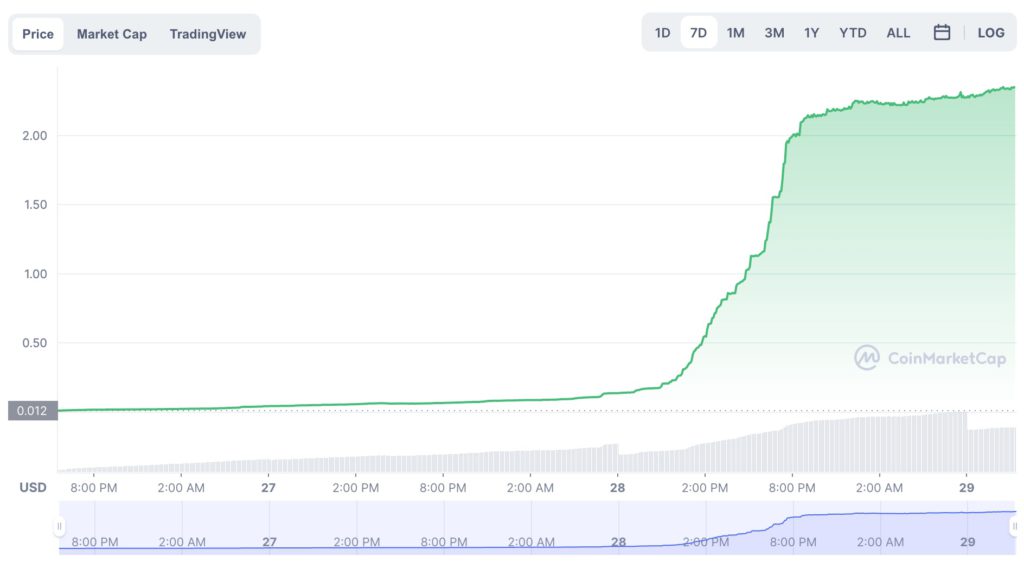 遊戲代幣Squid 從昨(28)日清晨低點 0.085 美元,開始一路暴漲,僅經過一天的時間已成長 3200 %,截稿前報:2.77 美元。