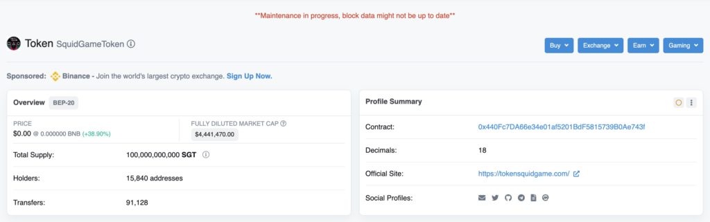 此外,SQUID 代幣的智能合約上也顯示「正在進行維護,區塊資料可能不會即時更新。」或許也是造成用戶無法及時出售的原因。