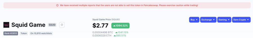 然而,據《CNBC》報導,CoinMarketCap 已發出警告,稱已收到「多份回報」,稱用戶無法在去中心化交易所 Pancakeswap 上出售此代幣。