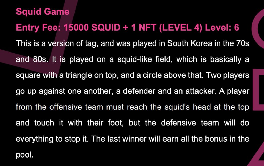 《魷魚遊戲》影集是描述了債務纏身的競賽者為了贏得巨額獎金而參與一場接著一場的生死遊戲。遊戲項目「Squid Game」也模仿影集中的六輪比賽,玩家可以透過競爭贏得獎勵代幣$SQUID